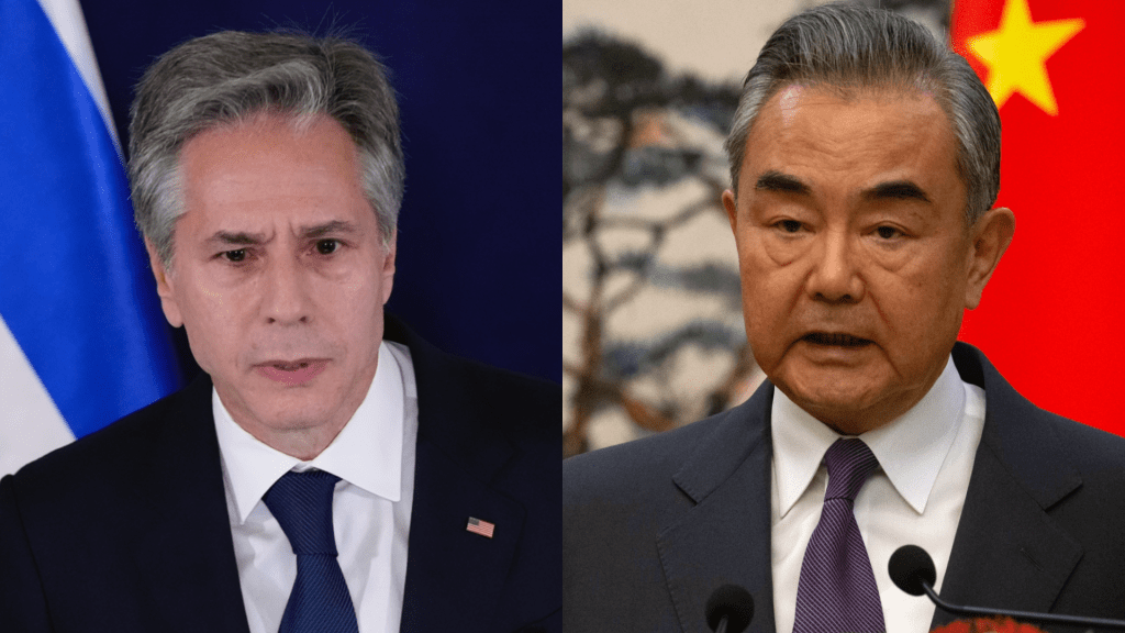▲中国外长王毅(右)应约与美国国务卿布林肯通电话。 美联社