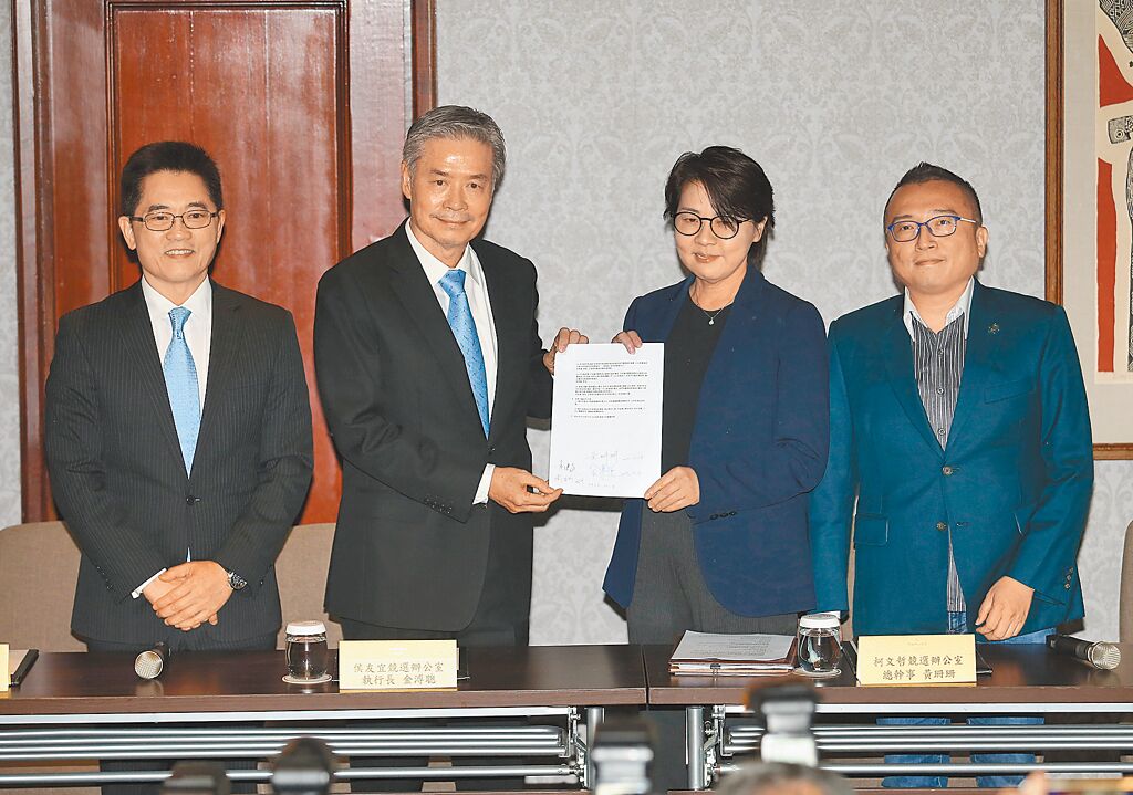 国民党昨由大选参选人侯友宜竞办执行长金溥聪与国民党秘书长黄健庭主谈,民众党则由大选参选人柯文哲竞选总干事黄珊珊与办公室主任周榆修出席。