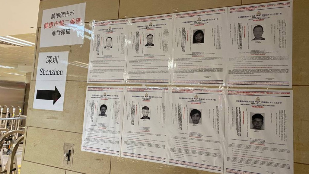 国安通缉令张贴在横跨深圳河的罗湖桥近香港口岸范围的一侧墙壁,供市民查阅,8人依次为任建峰、袁弓夷、郭凤仪、郭荣铿、许智峯、蒙兆达、刘祖廸及罗冠聪,除了附有照片,并分别列出他们的罪状。