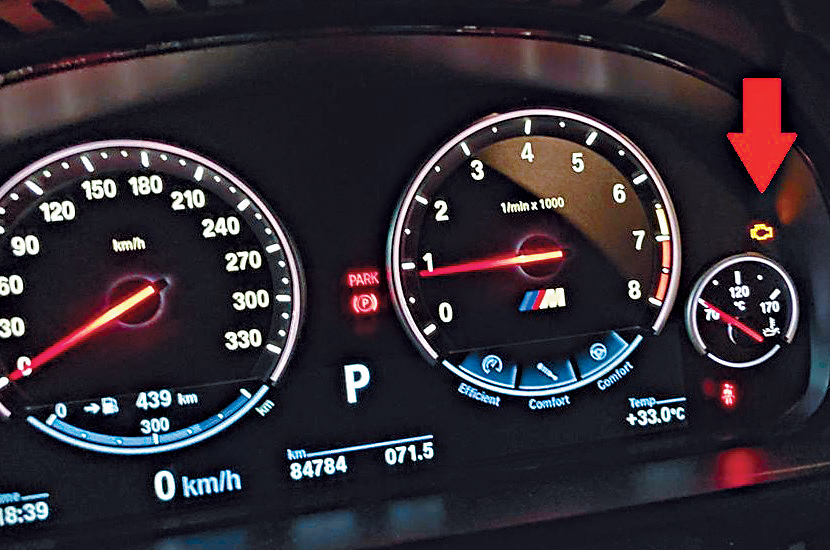 ▲宝马车主报称,座驾于内地车房更换排气喉后,“引擎故障警示灯”长期亮着(箭嘴),并出现死火。