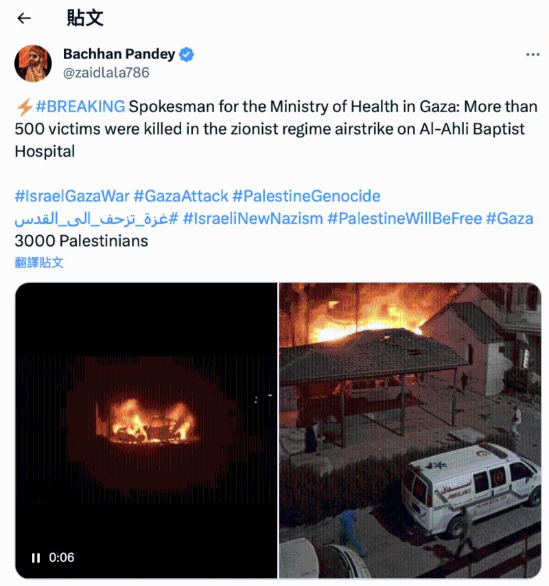 该间遭到炮击的医院名为Al-Ahli Baptist Hospital,位于加沙中部,从网上图片可见,遭炮击后火光熊熊,建筑物陷入火海。加萨的巴勒斯坦卫生部较早前一度表示,初步估计有200至300人在空袭中丧生,并指还有很多人埋在瓦砾之下。