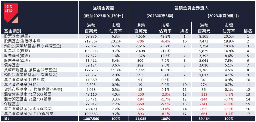 ▲2023 年第 3 季及首 9 个月的强积金资产类别资金流。