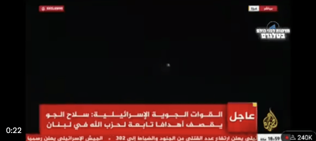 半岛电视台的这段直播画面摄于当地时间17日晚上6点59分,镜头拍到加沙夜空中出现一个发亮的物体,从飞行速度和形态看来,估计是一枚炮弹。该物体一直向高空直飞,其后在空中间断闪爆两次,随之突然急速改变方向,由向前变成向下坠落,然后便在镜头上消失。