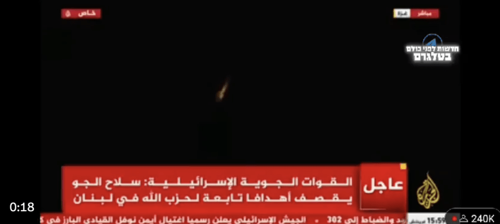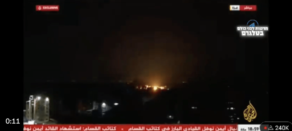 ▲半岛电视台的这段直播画面摄于当地时间17日晚上6点59分,镜头拍到加沙夜空中出现一个发亮的物体,从飞行速度和形态看来,估计是一枚炮弹。