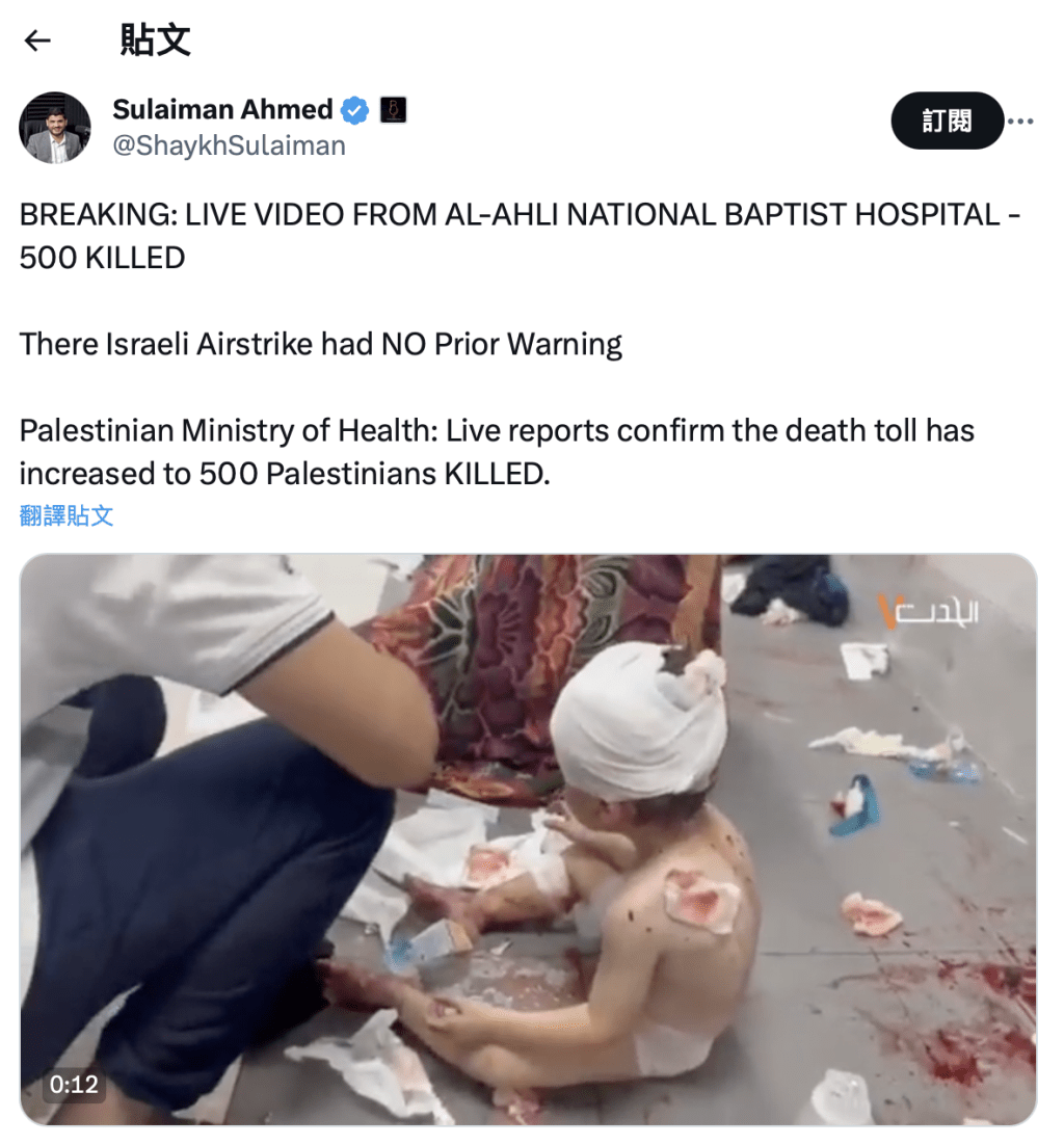 加沙地带中部阿赫利阿拉伯医院周二发生巨大爆炸起火,造成数百人死亡,成为以色列和哈马斯开火以来死伤最惨烈一役,巴勒斯坦官方指摘是以军所为,以军则指巴勒斯坦另一武装组织“伊斯兰圣战”才是元凶,至今真相未解。正当各方各执一词之际,半岛电视台播出一段医院遇袭前20秒的直播画面,成为了解事件的第一个重要证据。
