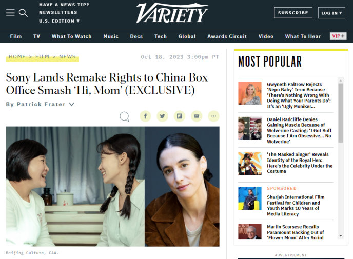 ▲《综艺》报道索尼翻拍《你好,李焕英》的消息。(Variety截图)