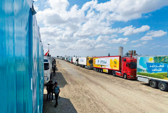 ▲运载人道救援物资的卡车,在拉法口岸的埃及入口处排长龙,等待关卡重开进入加沙。