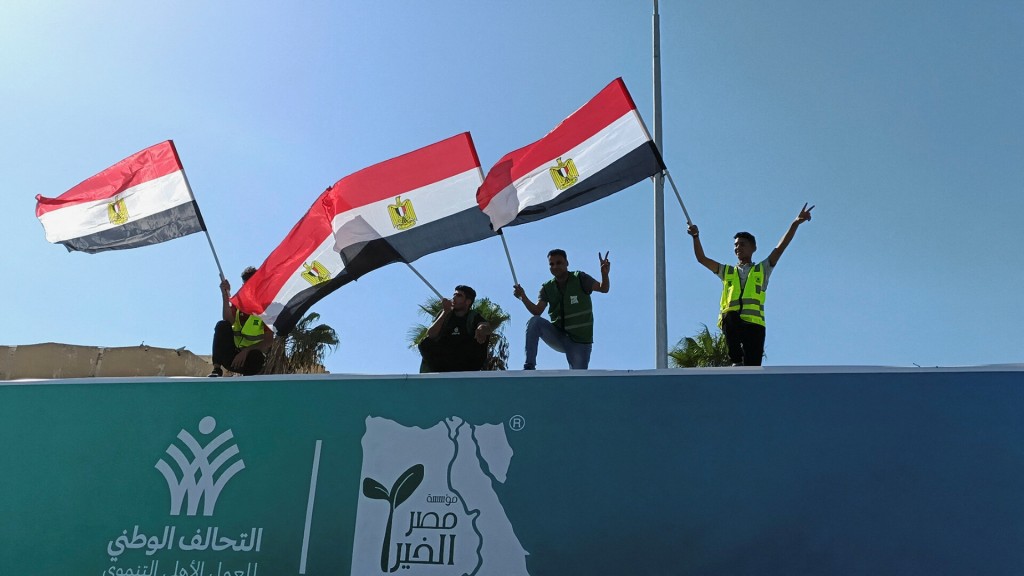 埃及国家电视台画面显示,装载人道援助物资的卡车驶向拉法口岸,前往被围困的加沙走廊。