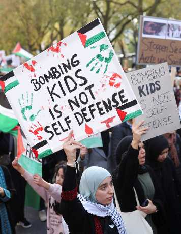 ▲德国杜塞尔多夫周六有示威者在声援加沙巴人的示威中举起反以标语牌。路透社