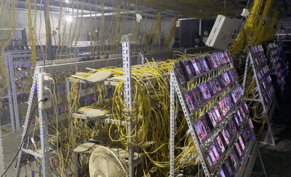 经过近3个月侦查,9月30日晚,砀山警方将24名疑犯抓获,查封13个涉案机房窝点,扣押涉案手机2.6万多部。 从网上流出相片所见,涉案机房内有大量手机被集中放在手机架上,手机背后更有无数疑似充电线,相信用作手机不停自直播数据之用。
