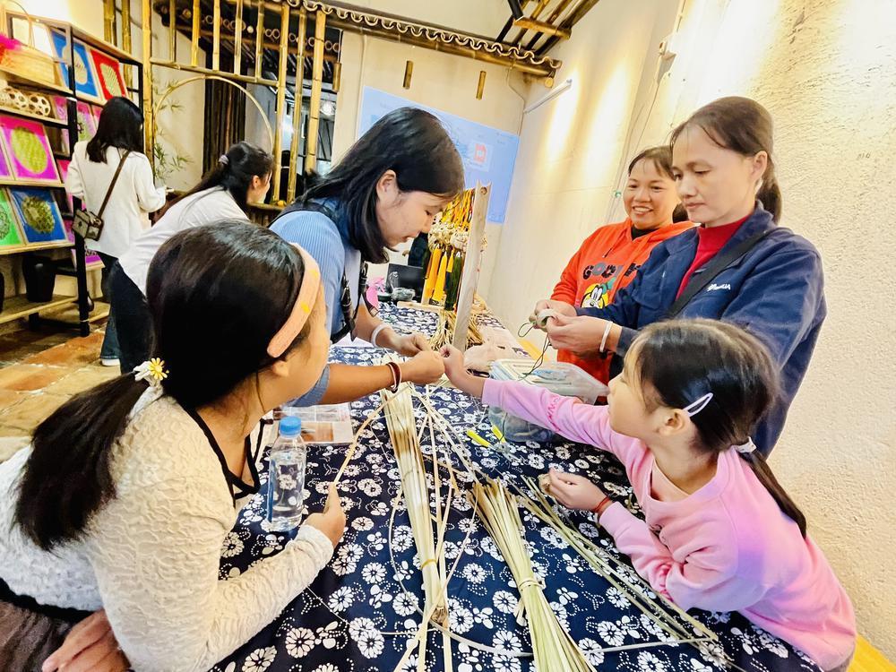 ▲旧墟风情街上的竹编非遗工作坊吸引小朋友动手体验。