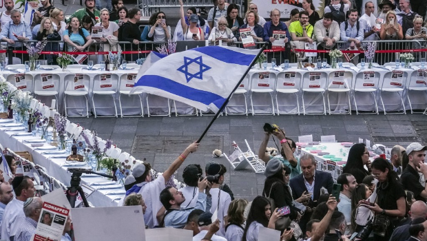▲美籍以色列人及他们的支持者在纽约时代广场举行集会,展示被哈马斯挟持的亲友肖像,要求让他们尽快获释。美联社