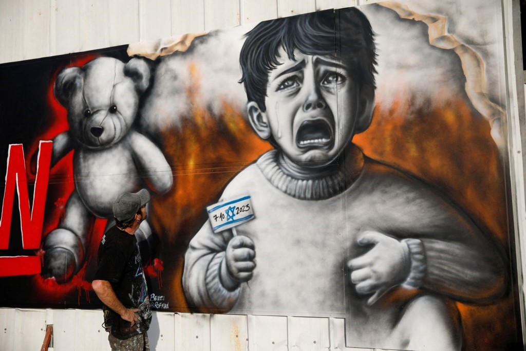 ▲以色列街头画家绘画小孩子哭喊海报,要求哈马斯尽快释放人质。路透社