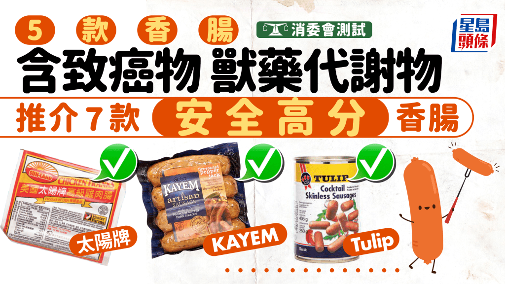 消委会测试结果显示,有7款香肠的总评分获4.5分,比较安全, 不含兽药致癌物: