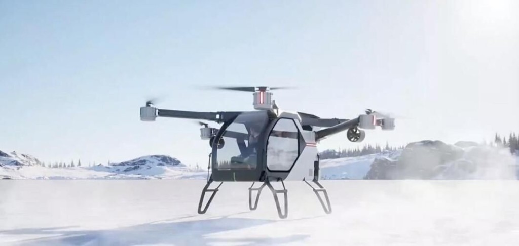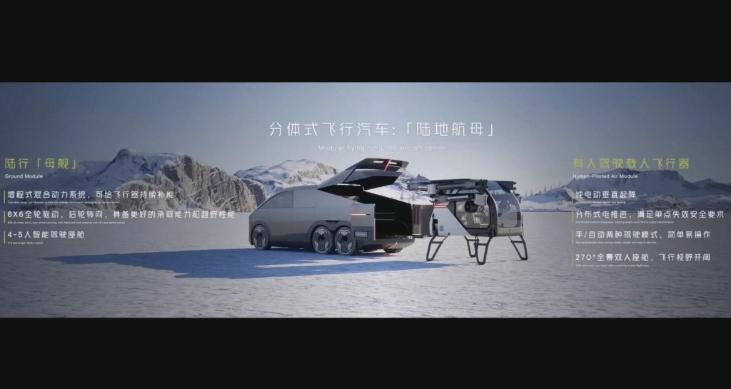 ▲可乘载2人的独立飞行器由纯电驱动,并可从运载的增程混能车补充电力。