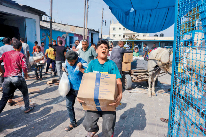 ▲联合国救援机构在加沙地带中南部迪尔巴拉的救援物资仓库,上周六被民众闯入抢夺面粉等物资。