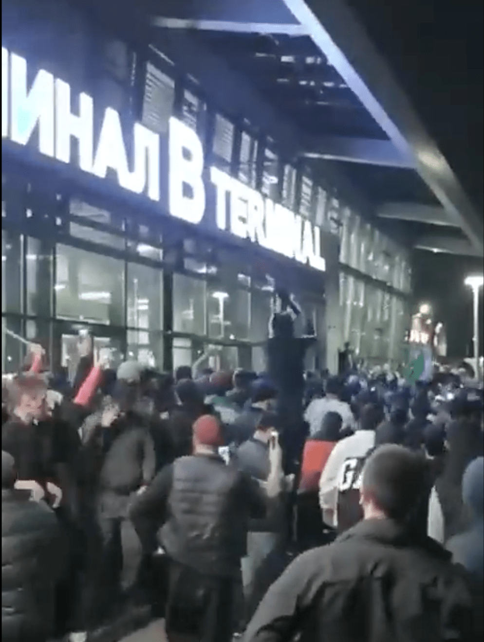 当地传媒报道,一架来自特拉维夫的俄罗斯红翼(Red Wings)公司航班抵达马哈奇卡拉机场的消息传开后,数百人即闯入机场寻找以色列人。根据社交媒体片段,数以百计年轻人,部分人高举巴勒斯坦旗帜或谴责以色列的标语,打破玻璃门,闯入机场客运大楼,高喊“真主伟大”的口号。