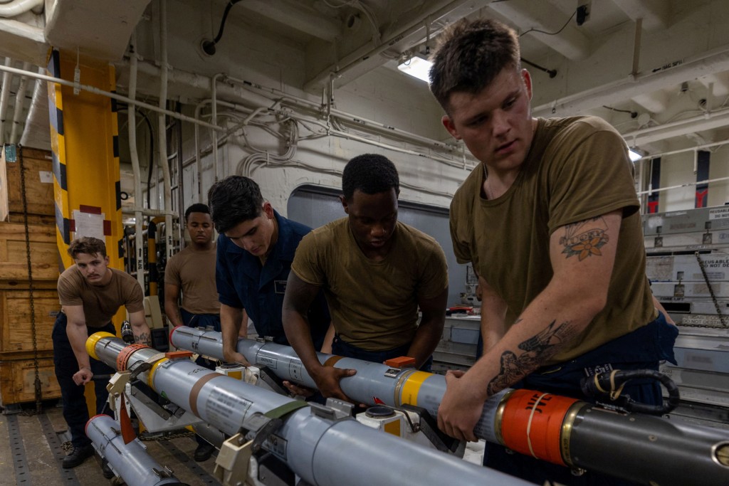 ▲美军两栖攻击舰巴丹号上人员协助装配导弹。 路透社