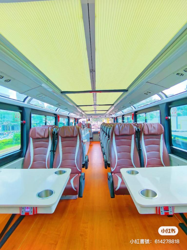 ▲旅游观光巴士空间宽敞,设有皮质座椅及可以容纳4人的小方桌。