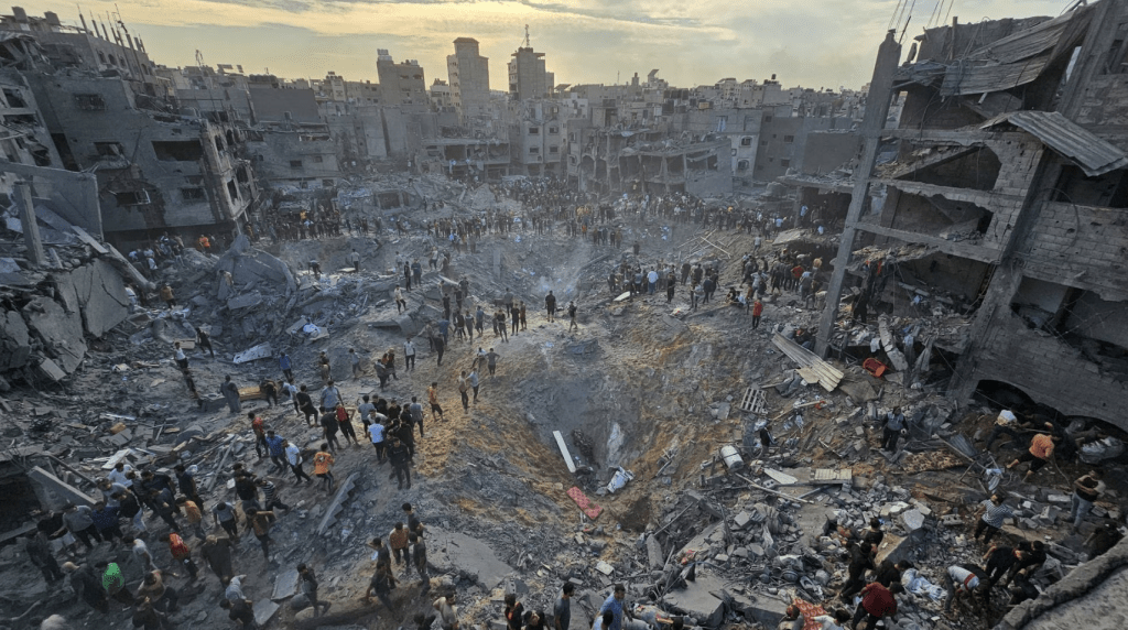 从通讯社图片可见,爆炸在充满瓦砾的地区留下了巨大的弹坑,周围是被摧毁的混凝土建筑,民众在建筑物废堆中寻找幸存者。加沙卫生部在声明中说:“以色列锁定加沙走廊北部贾巴利亚难民营大片住宅区发动令人发指的屠杀,造成50多名烈士丧生、约150人受伤和数十人被埋在瓦砾堆下。”