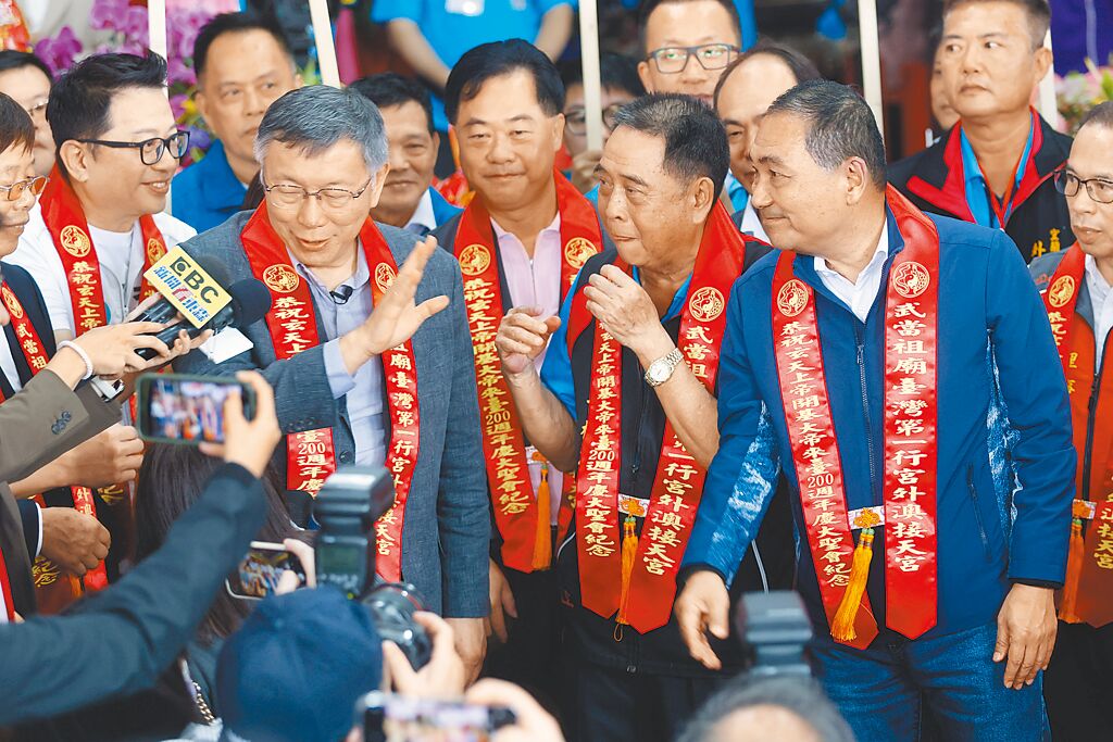 接天宫昨日举行200周年庆典,柯文哲、侯友宜先后抵达,在仪式开始前,侯先向柯伸手致意,柯文哲碰了一下手,2人即分开走向预定位置,分别站在接天宫主委黄椿池左右两侧,致词时2人互相礼让,直到庙方协调“照顺序来,柯主席先到先讲。”