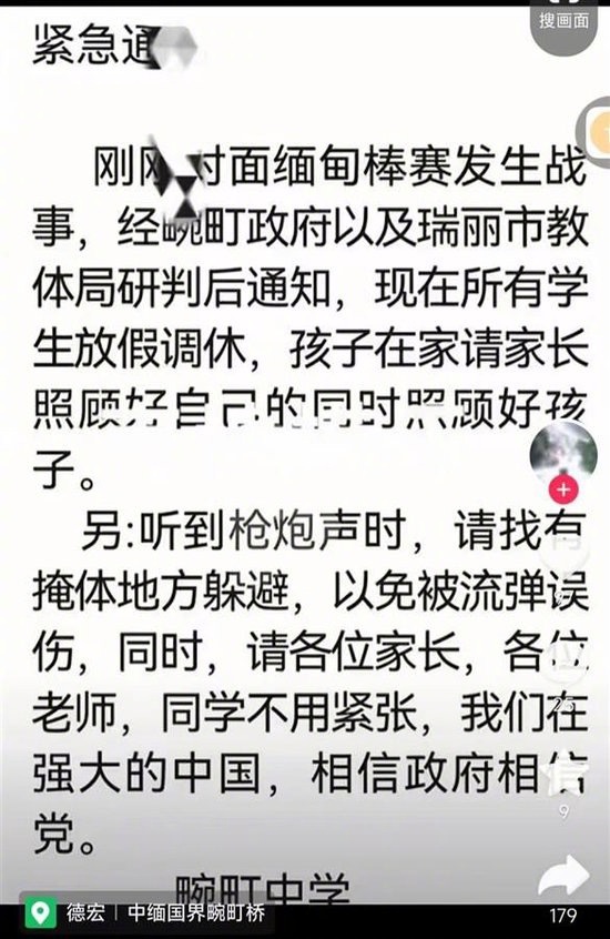 “极目新闻”报道,一份落款为“畹町中学”的网传微信截图显示,该校通知称,因缅甸棒赛发生战事,所有学生放假调休,若老师同学听到枪炮声,要找有掩体地方躲避,以免遭流弹误伤。