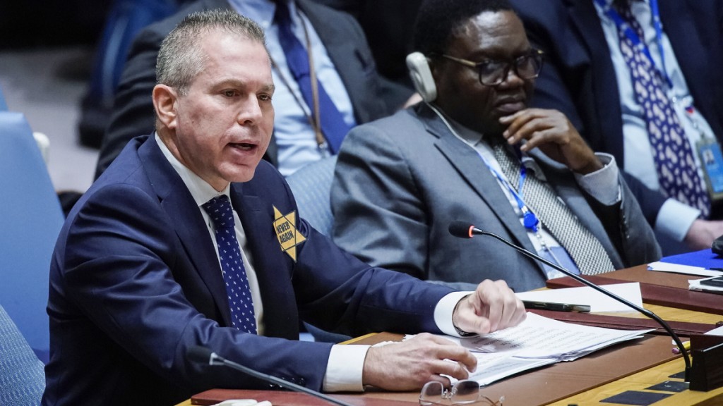 ▲以色列常驻联合国代表埃尔丹配戴黄色六芒星抗议,引发争议。 美联社