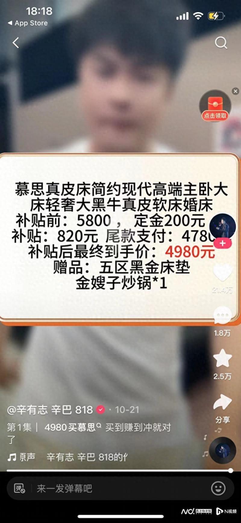 10月21日,辛巴在快手发布的视频显示,慕思与辛巴合作推广一款床垫,产品最终到手价为4980元/套,还赠送一款五区黑金床垫及金嫂子炒锅。这款产品名为“慕思真皮床简约现代高端主卧大床轻奢大黑牛真皮软床婚床”。