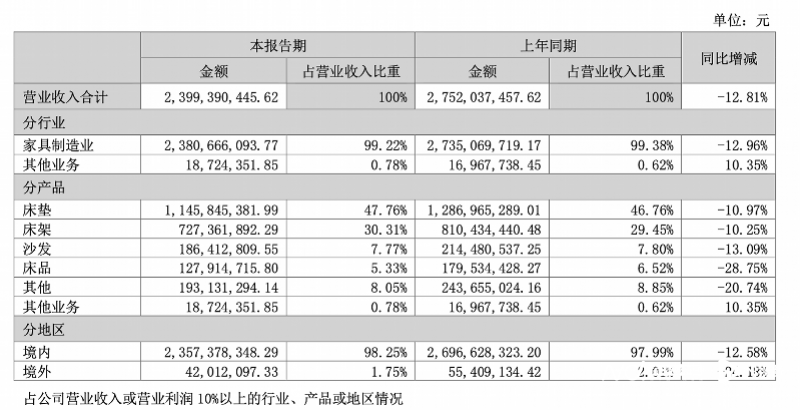 此次引发争议的床垫为其核心产品,今年上半年,慕思股份来自床垫的收入为11.46亿元,同比下跌了10.97%,占营收的比例为47.76%。在最新的三季报中,慕思股份尚未披露各个产品的收入数据。