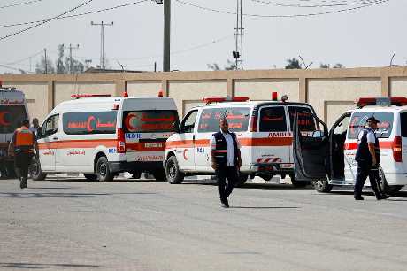 ▲加沙南部靠近拉法口岸有救护人员等候将巴人伤者送往埃及治疗。路透社