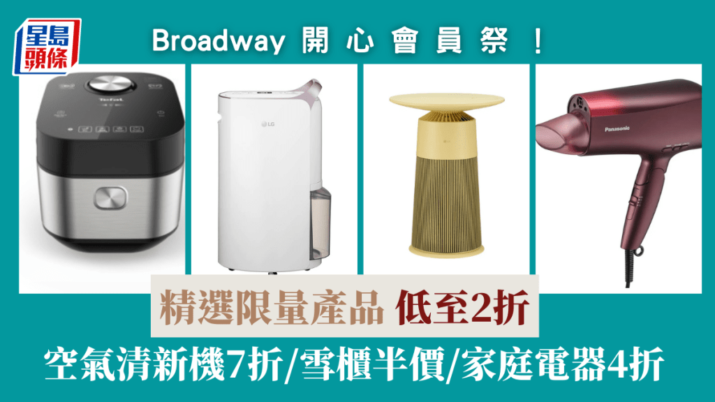 Broadway百老汇优惠|百老滙由即日至11月13日举行为期一连11日的“Broadway 开心会员祭返黎啦”优惠,逾百款精选产品包括电视机、手提电脑、耳机、智能手机、Soundbar、空气清新机、吸尘机、抽湿机及旅行用品等统统都有减价,部分低至2折发售,各位百老汇会员记得把握时间“扫平货”!