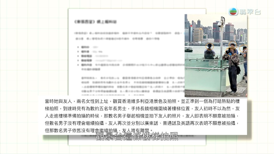 《东张西望》最新一集中提到,近日尖沙咀海傍出现一班疑似偷拍的中年大叔龙友。节目组以偷拍方式直击这群大叔出没,而地点就在海傍一个热门打卡楼梯位。从片段可见,该处吸引不少美女游客到场留影,当中不乏性感低胸美女。但摄制队发现,这班大叔并非什么人来到留影都会拍摄,有部分中年女士来到时,这班大叔似乎不感兴趣,反而一见性感年轻女性站在海边,便即时拿起镜头狂拍。