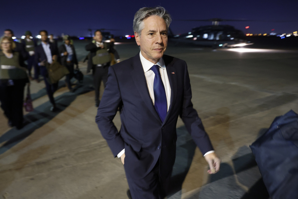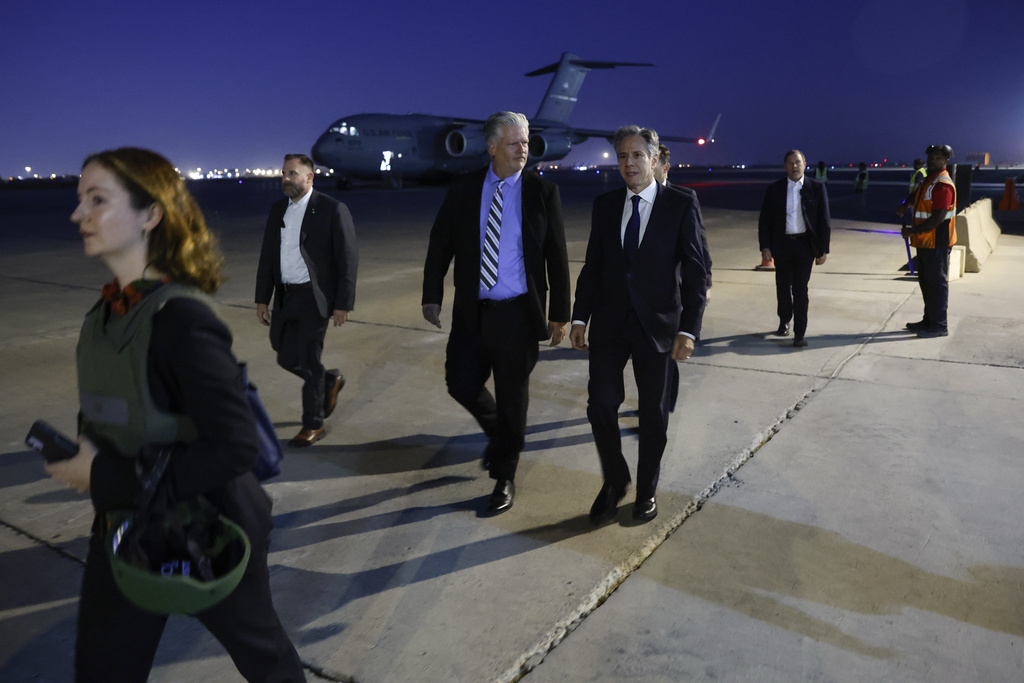 路透社报道,布林肯在结束约旦河西岸的访问后,抵达伊拉克首都巴格达国际机场。他穿上防弹背心,并搭乘直船机直往绿区。他其后与伊拉克总理举行会谈。
