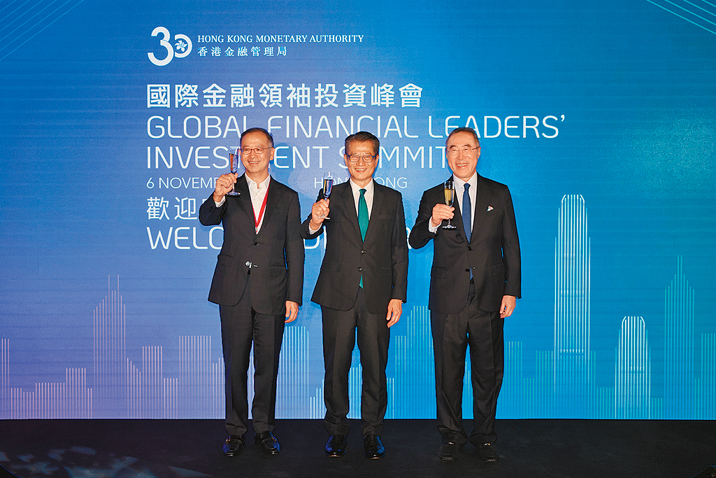 ▲(左至右)金管局总裁余伟文、财政司司长陈茂波及西九文化区管理局董事局主席唐英年,昨出席国际金融领袖投资峰会欢迎晚宴。