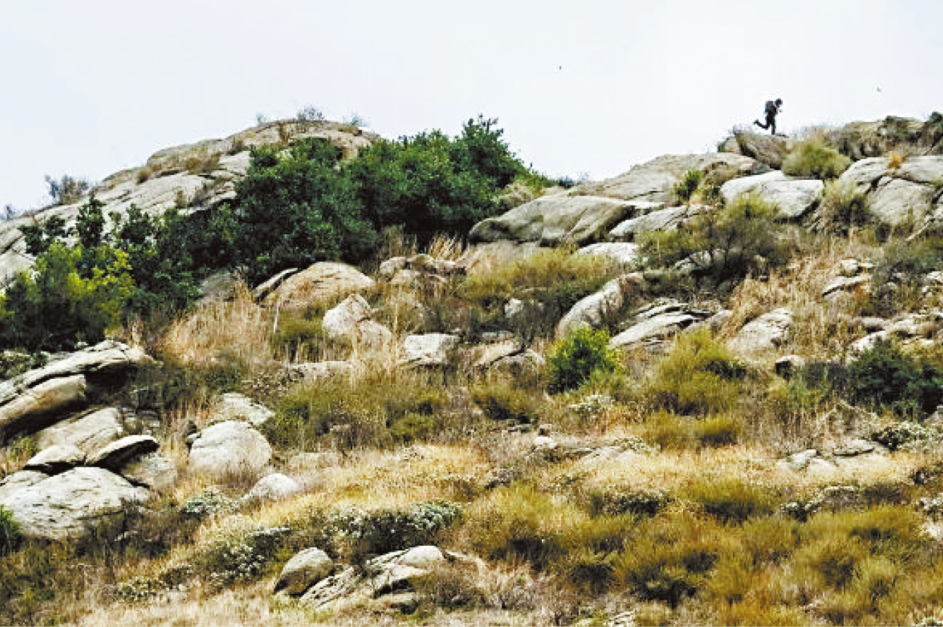 ▲环保人士Aaron Echols爬上岩石山顶,这裡有一棵加州万年古树。 洛杉矶时报