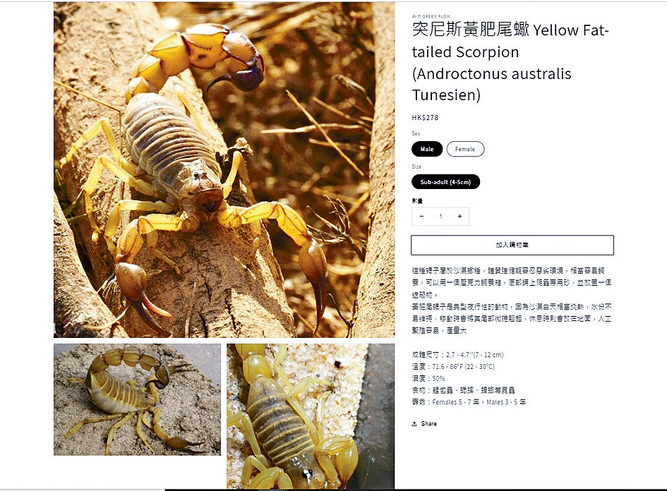 黄肥尾蝎“周街卖”,成为近日宠物界热话,事件中的主角“黄肥尾蝎”属沙漠蝎子,极具攻击性,有研究指其毒性较山埃强20倍,可与被指世上最毒的黑曼巴蛇(Black Mamba)相提并论,是世界上最危险的蝎子之一。前年埃及发生水灾,黄肥尾蝎等窜入民居致数百人被螫伤,甚至出现死亡事故。惟本报发现,近日竟有店铺在网上出售“突尼斯黄肥尾蝎”,售价278元,可选雌雄,均为亚成体(幼体和成体之间的阶段)。店家在页面上声称该沙漠蝎“相当容易饲养”,并介绍其是“典型夜行性动物”、“体质强健能容忍恶劣环境”等,却未有提及其毒性。
