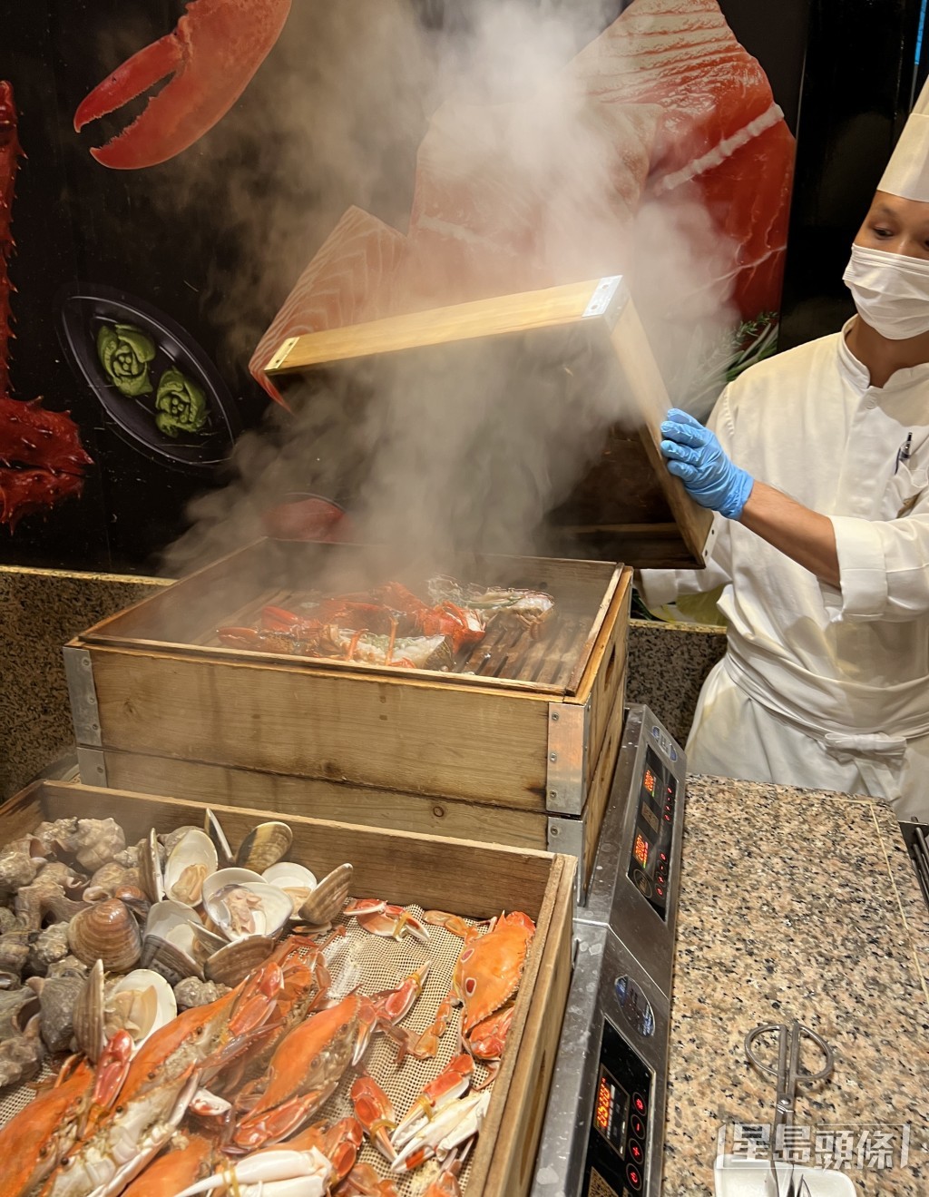 吃过几间深圳酒店自助餐,福田香格里拉的鲜咖啡算是比较令人难忘的一间。餐厅环境阔落宽敞,特别设有巨型的红色海鲜船,包括蟹脚、冻蟹、冻虾、青口、田螺等十数款冷盘海鲜,看起来相当丰富澎湃。餐厅内更特设的巨型鱼缸,食客可以即点即捞,大蚬、元贝、肉蟹、鲍鱼、濑尿虾,再交由厨师烹调,保证新鲜生猛。主厨放入木箱隔水蒸煮,开口大蚬粒粒饱满。蒸起立即上碟,肉质鲜嫩,更吃得出咸香。同时每位食客在假日可以享用到一只龙虾,同样是即捞即制,龙虾两吃,既可以蒜蓉蒸,亦可以芝士焗。另外亦有蒸生蚝、当造大闸蟹,多款日式刺身、寿司。若是喜欢品尝海鲜,绝对会感到满意。