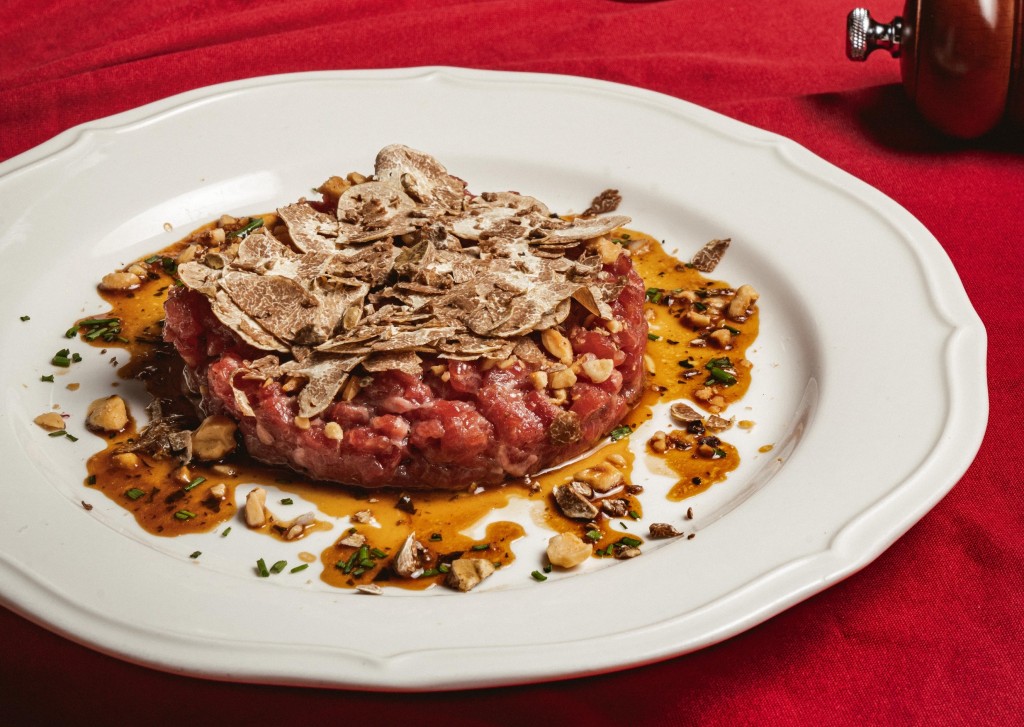 ▲Pirata限定4道菜的白松露晚餐——松露和牛他他,将和牛的浓郁香味与阿尔巴顶级白松露的口感融为一体,佐蘑菇汁及烤榛子更清香。
