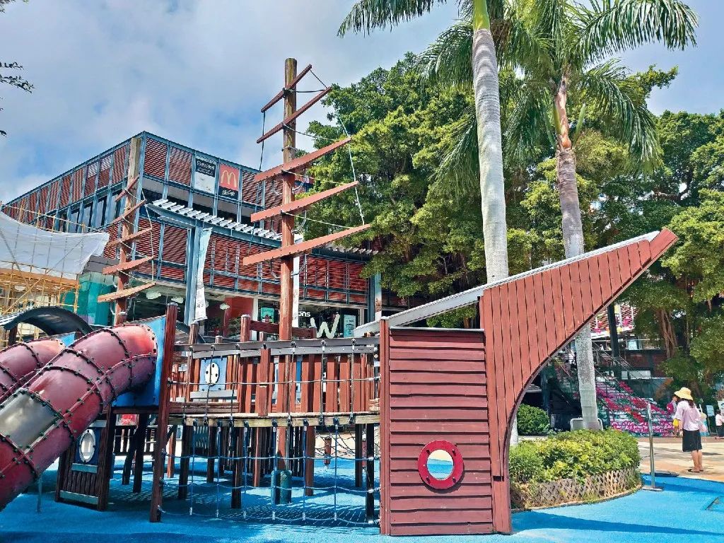 沿着平台电梯一路降至地面露天广场,看见其他小朋友兴高采烈地围着某设施跑跑跳跳,原来是一座面向海湾的海盗船造型游乐设施。