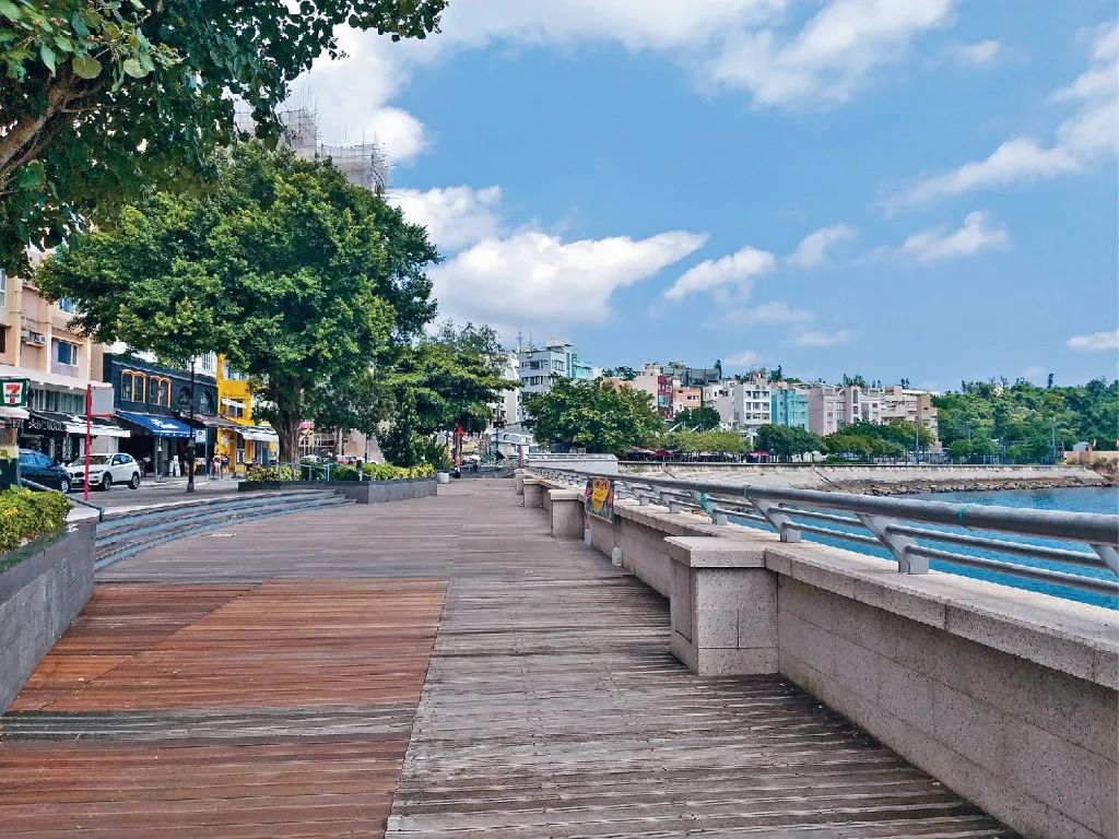 海滨长廊旁有一列整齐大树,阻隔马路灰尘外,也划出让行人自在行走的步道。步道由木条铺成,营造出与周遭低矮楼房相衬的闲适感。走在其中,犹如置身异国小镇,舒适安静。