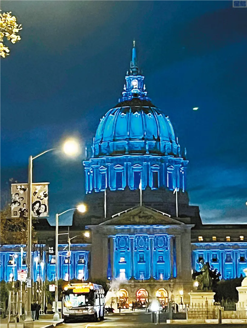 ▲旧金山市府大楼被妆点成APEC蓝色。记者彭诗乔摄
