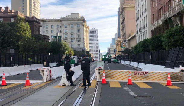 记者13日早上所见,通往该酒店的California街与Sacremento街一带,正紧锣密鼓设立关卡,铺设门禁的地方已经鼓起水泥,车辆不得不慢行辗过,警员告诉记者等工程完工就会开始禁止普通车辆与行人通行,并检查进入红区内的过往行人和车辆。行经当地的California街的缆车将暂停。