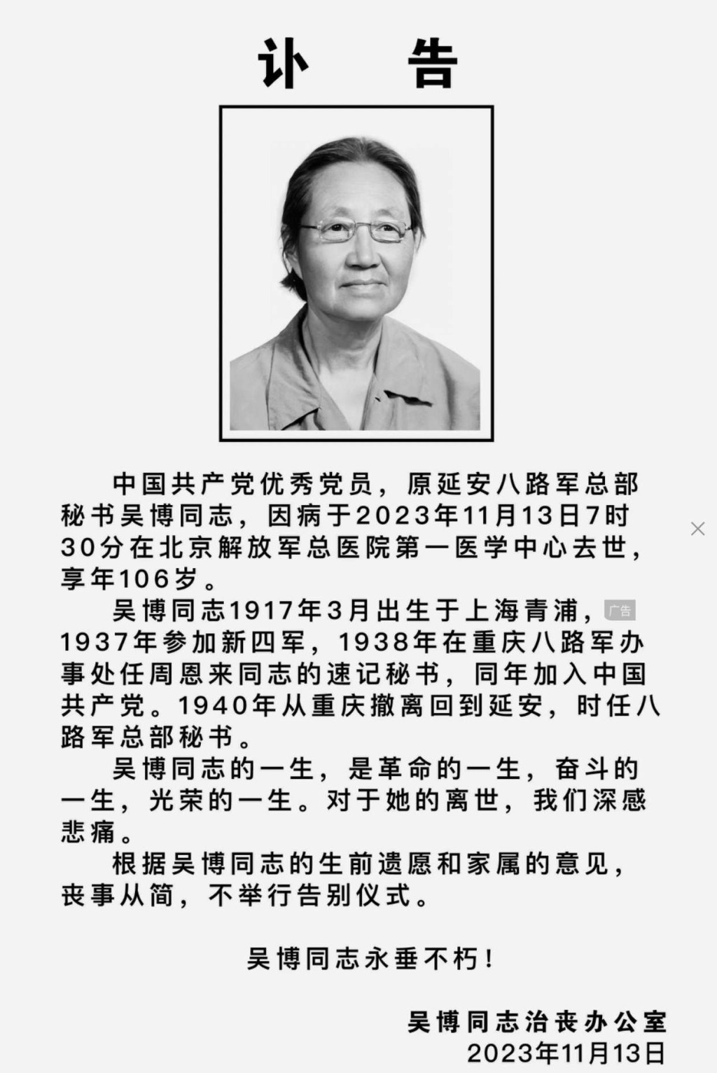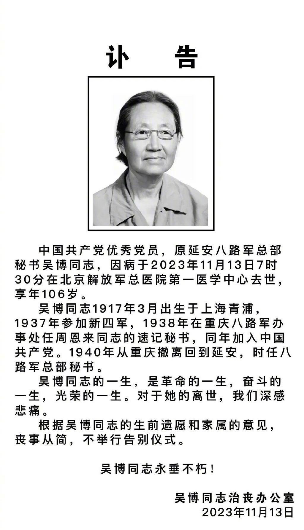 据官方发出消息,八路军老战士、原延安八路军总部秘书、叶剑英元帅夫人吴博,因病医治无效,于2023年11月13日上午在北京逝世,享年106岁。