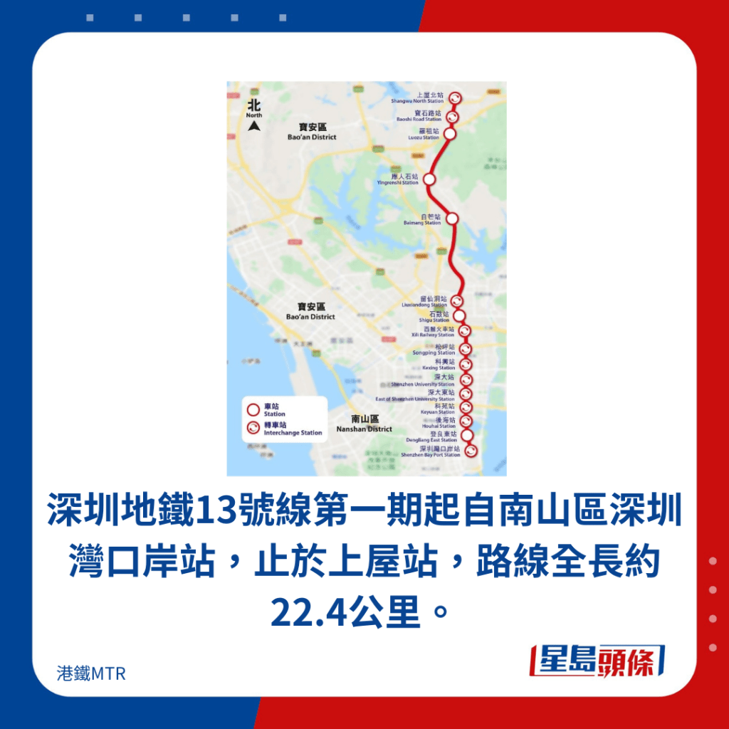 ▲深圳地铁13号线第一期起自南山区深圳湾口岸站,止于上屋站,路线全长约22.4公里。