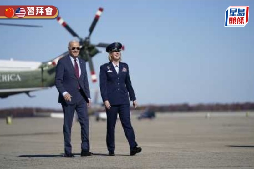 ▲拜登周二由女军官陪同下,步行向空军一号专机将前往旧金山参加APEC峰会及会晤习近平。美联社