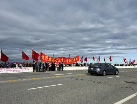 习近平14日下午抵达旧金山国际机场。大批侨胞一早在机场外等候,拉起“热烈欢迎习近平主席访问美国”横幅,挥动五星红旗,迎接习近平主席车队。