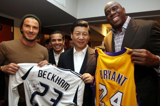 ▲习近平2012年访美时,获曼联球星碧咸及湖人队球星庄逊赠送球衣。 人民网