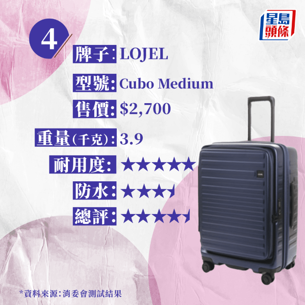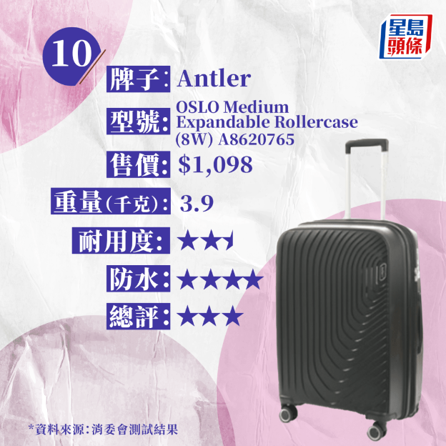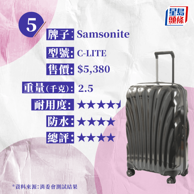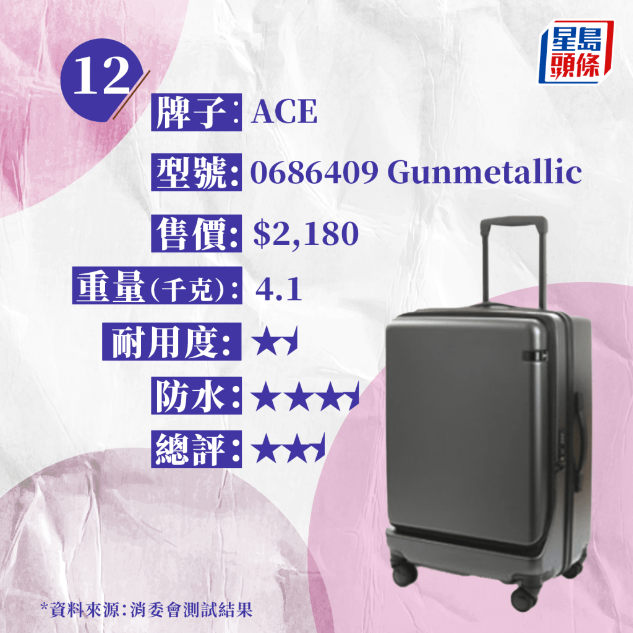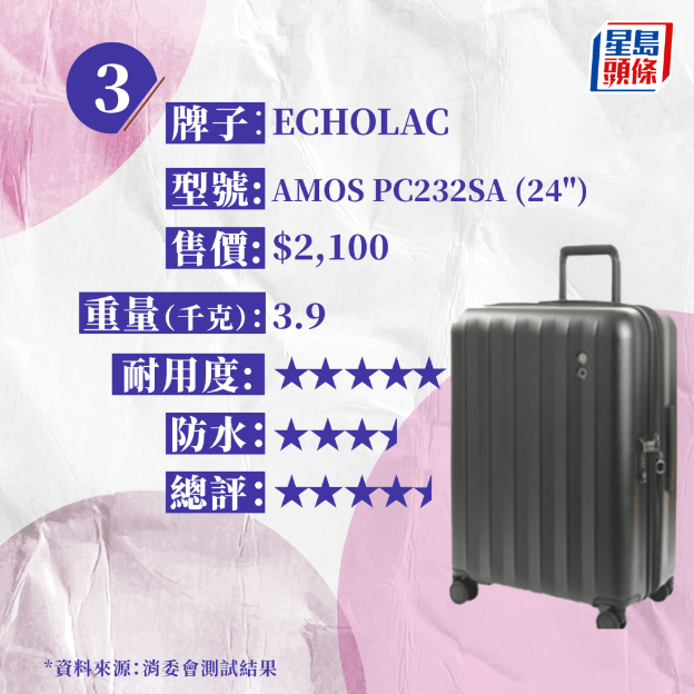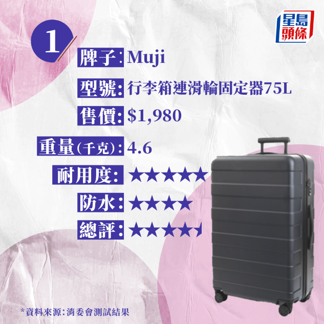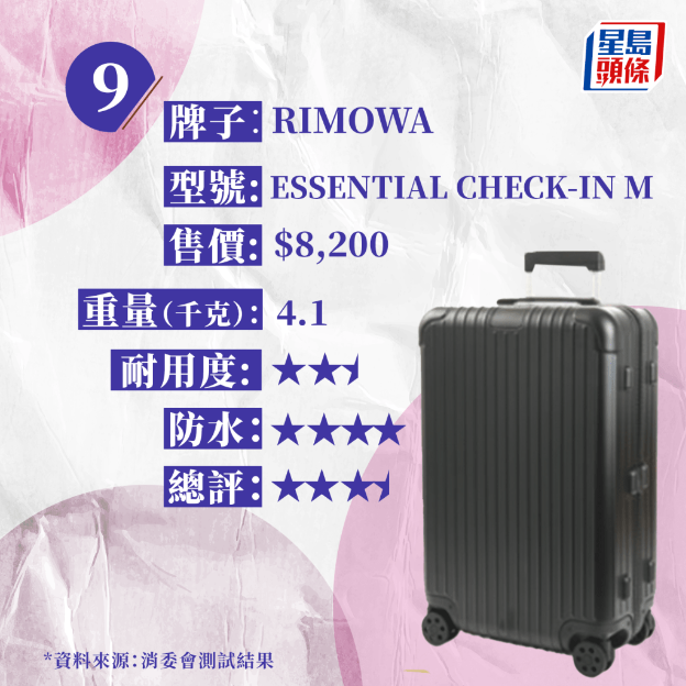 整体评分最高(4.5分)的4款样本中,有2款售价为2,500元以下,分别为“Muji 行李箱连滑轮固定器75L”(约1980元)及“ECHOLAC AMOS PC232SA(24″)”(约2100元)。而售价最高的1款“RIMOWA ESSENTIAL CHECK-IN M”( 约8,200元),整体评分仅获3.5分,特别在路面行走性能与拉杆强度方面,在行走路程未及 60公里时,拉杆手柄便断裂,表现强差人意。