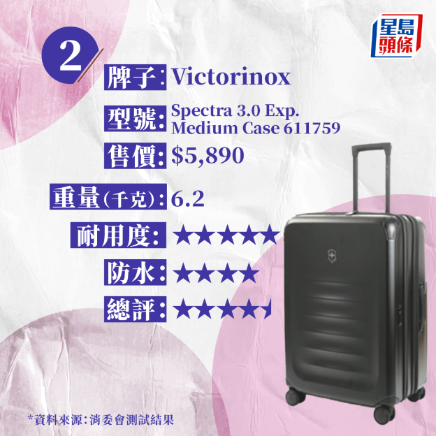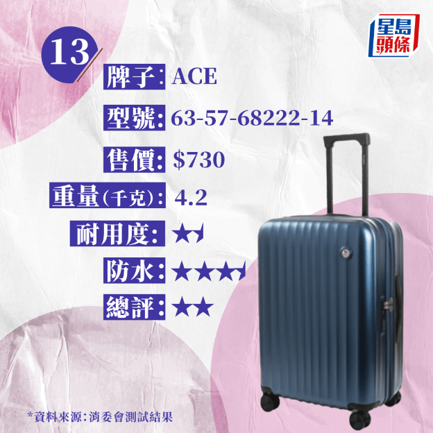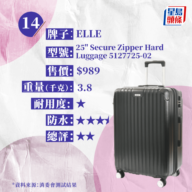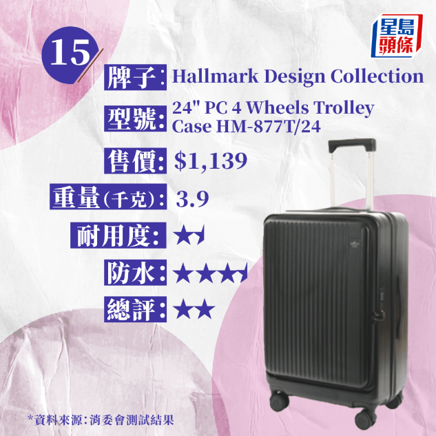 是次测试的15款样本均为中型硬身行李箱,高度约24吋至28吋,属于寄舱行李类别,全部配备可供海关人员以保安钥匙打开检查的TSA密码锁,外壳均由胶料制造,重量约由2.5千克至6.2千克,售价由730元至8,200元,相差逾10倍。