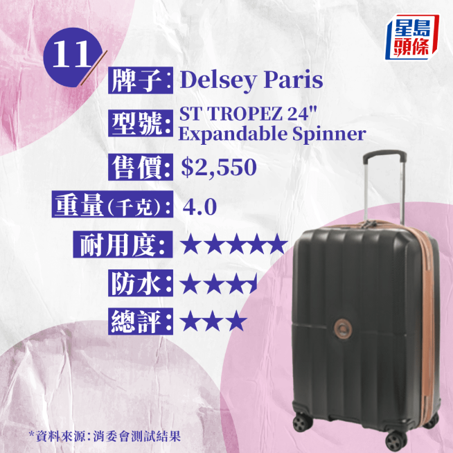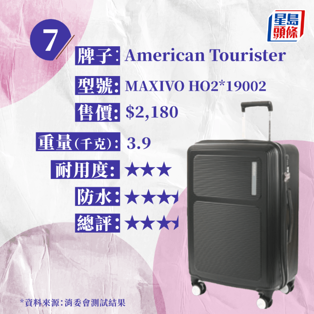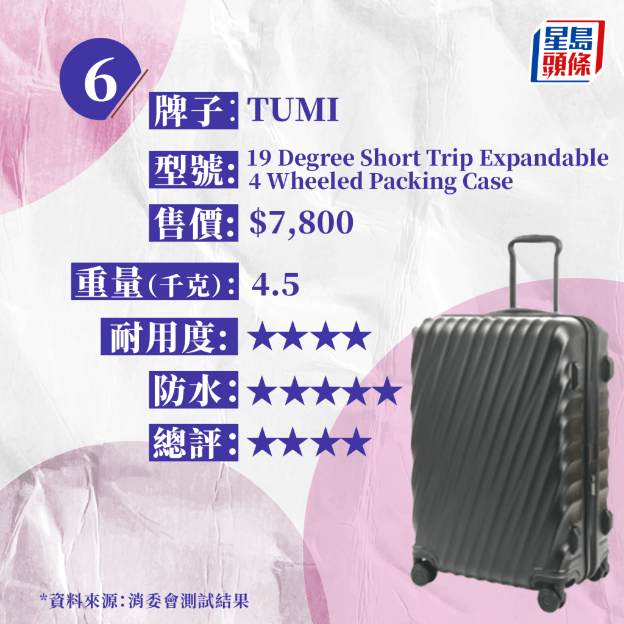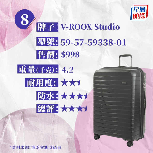 圣诞新年旅游旺季即将来临,不少人会买行李箱准备外游。消委会测试15款中型硬身拉链式行李箱的耐用和化学安全程度,其中7款样本经长距离拖行后,分别出现车轮脱落、箱身破裂、拉杆或拉杆手柄折断、松脱等情况。售价最高的“RIMOWA ESSENTIAL CHECK-IN M”(约8,200元(港币,下同)),整体评分仅获 3.5 分,在行走路程未及 60公里时,拉杆手柄便断裂。其中一款样本的手挽有部分物料检出的塑化剂含量超出欧盟REACH法规订立的上限45倍,或会影响生殖健康。